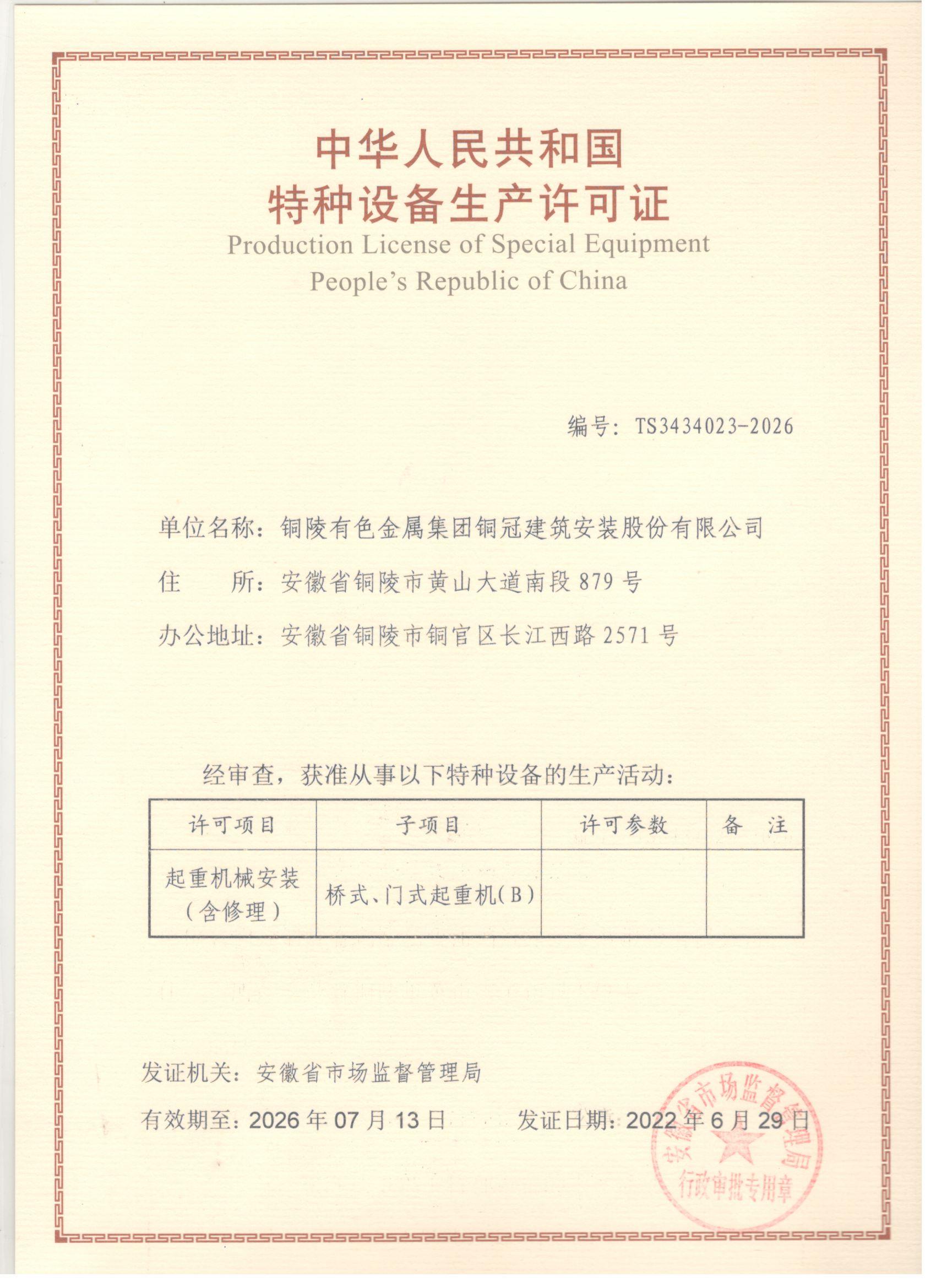 特种设备安装改造修理许可证-起重机械